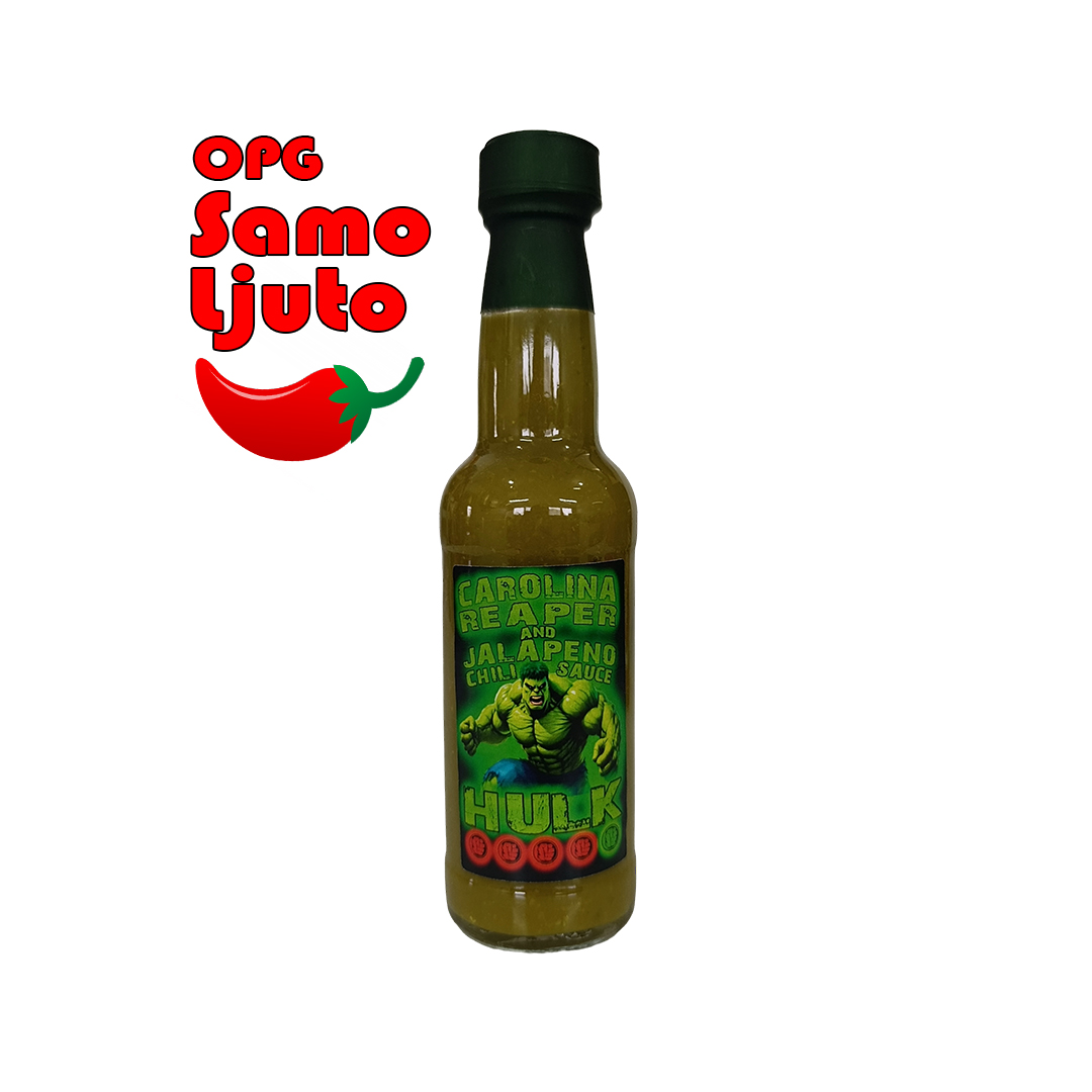 Hulk chili umak kombinira zelenu Carolina Reaper i Jalapeño papričicu kako bi stvorio snažan, aromatičan i izuzetno pun okus. Zelena Reaper donosi intenzivnu, prodornu ljutinu i karakterističnu voćno-biljnu aromu.